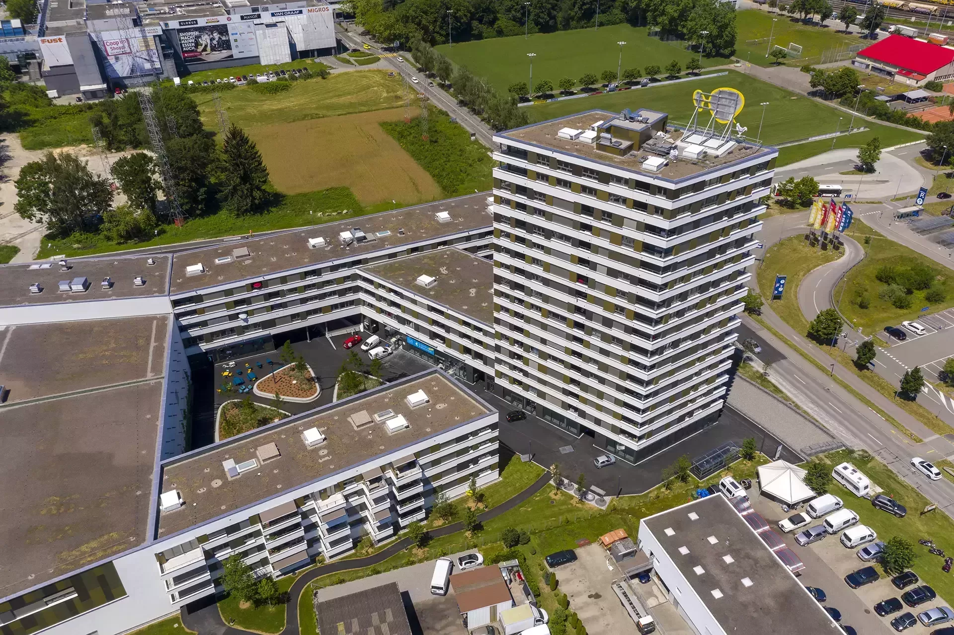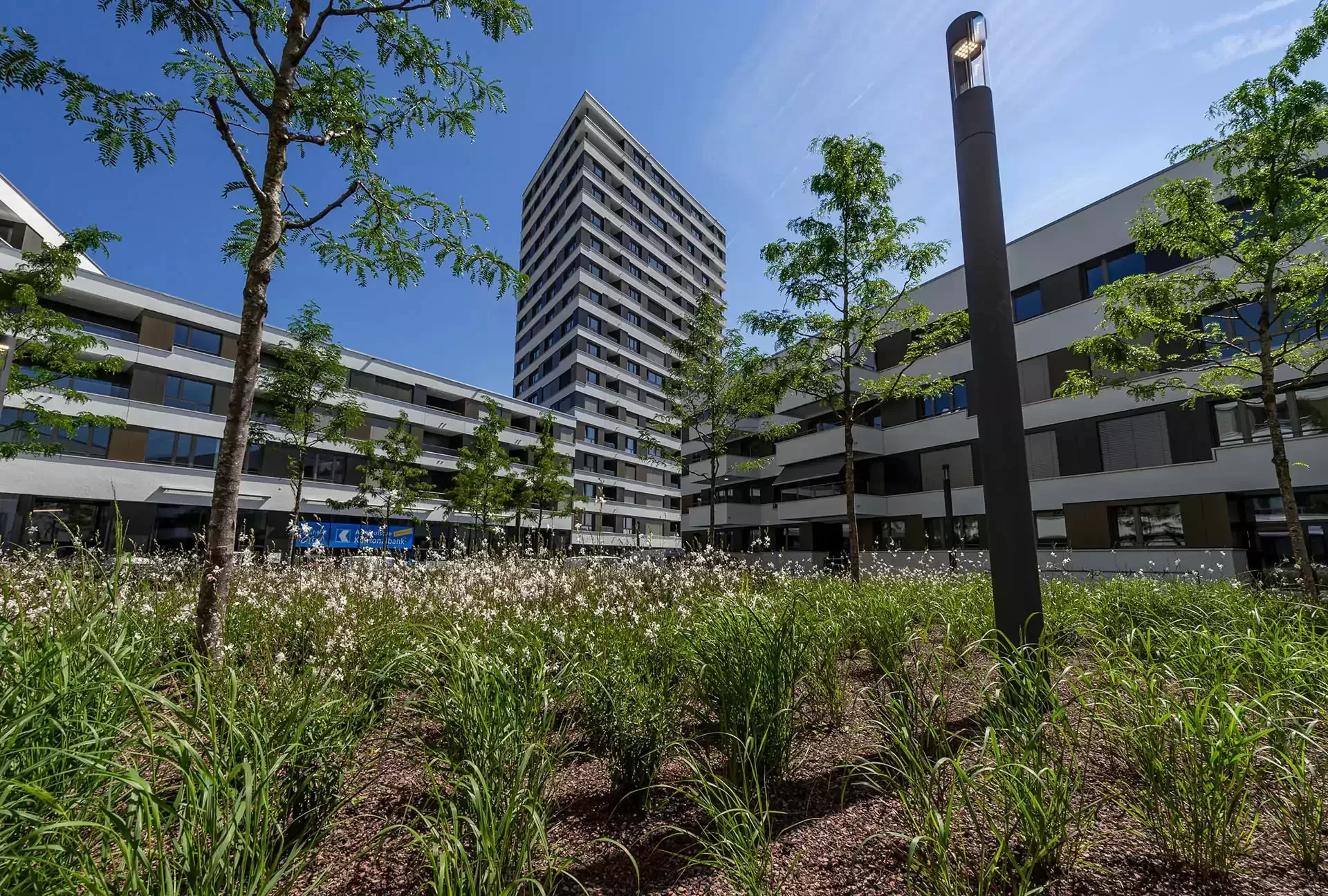The site includes a 17-storey tower and an elongated, curved building along Sandäckerstrasse, which offer modern workspaces and set new standards in the professional world. These buildings are designed to create functional and inspiring working environments for a variety of companies. The proximity to various services and good transport links contribute to the location’s appeal. A quiet inner courtyard in the north of the site offers space for relaxation breaks and informal meetings.