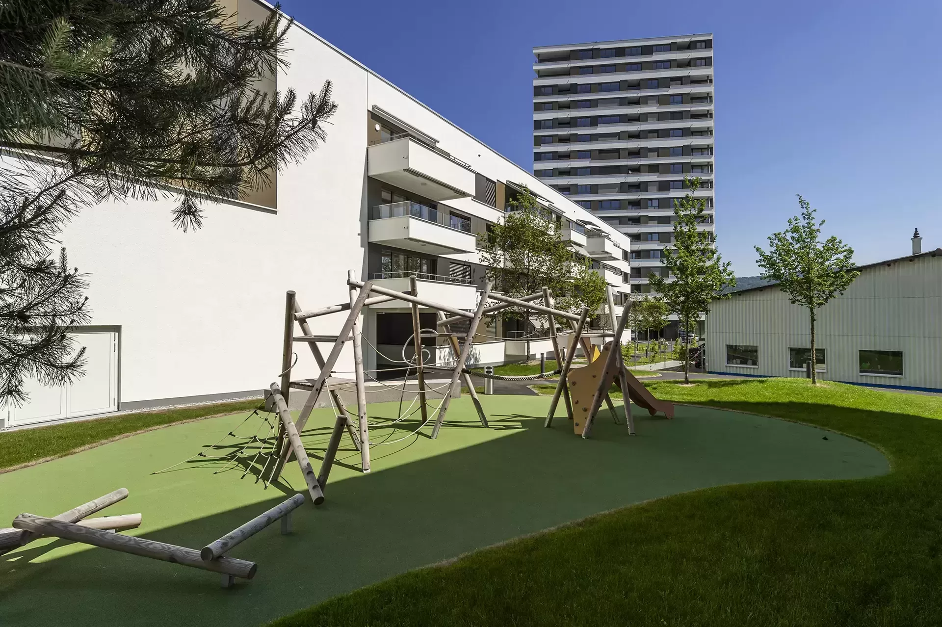 Two 4-storey residential buildings with 195 apartments were built. This modern living concept offers a variety of options, adapted to the needs of families, couples and individuals of all ages, and reflects the diversity of urban life. The arrangement of the buildings around the quiet inner courtyards on the south side creates a relaxed living atmosphere. In addition, the good public transport connections with a bus stop nearby make it easy to get around.