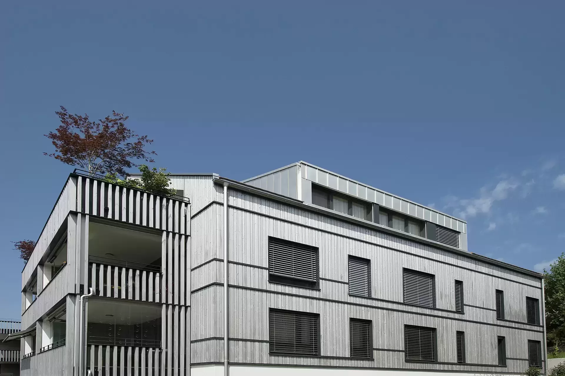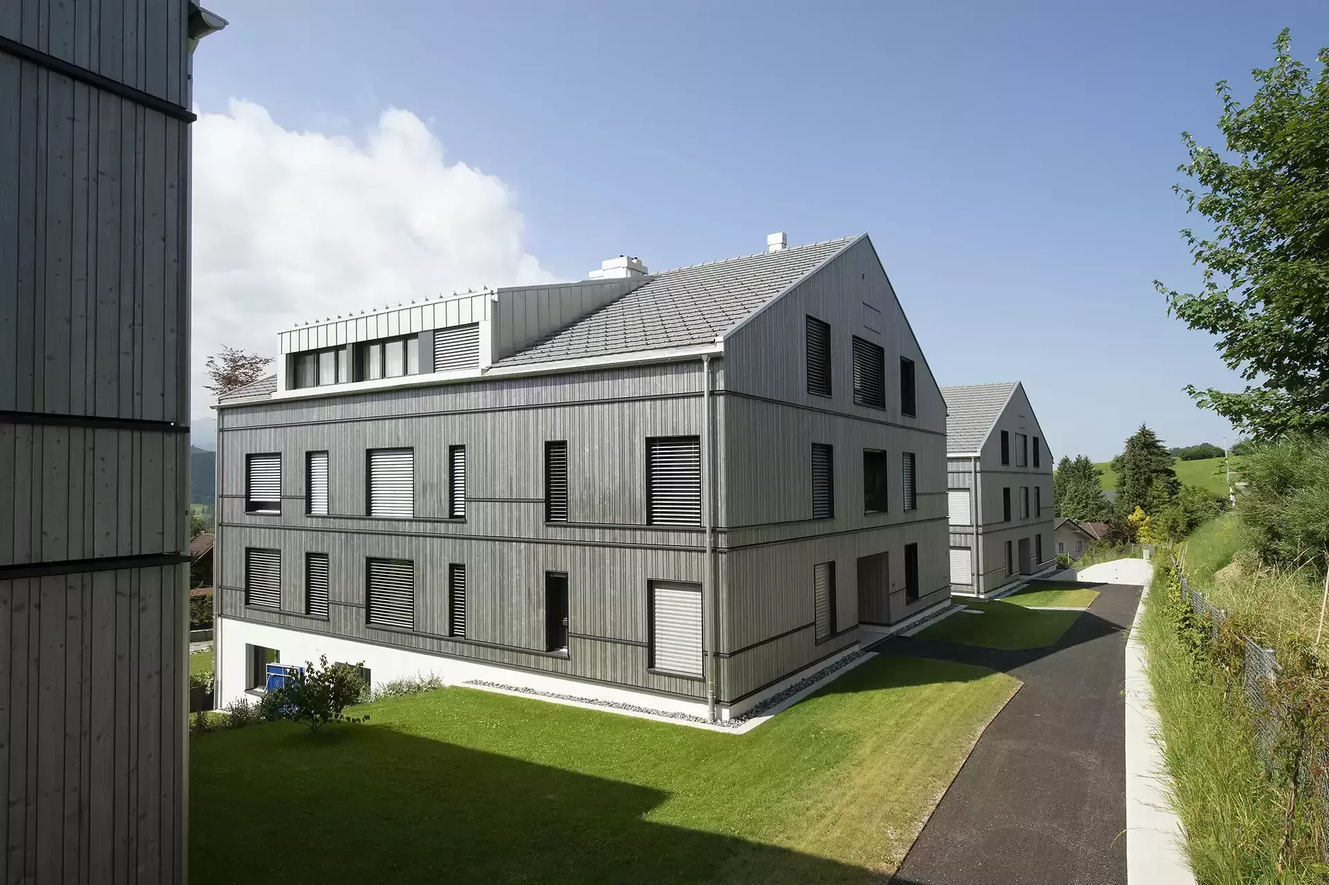 The apartment blocks have an elegant and clear architecture with a pitched roof and wooden façade in simple anthracite. All buildings are connected by a shared underground car park, while each «UNICO» building also has an accessible lift. Particularly noteworthy is the sustainable concept of the project, which boasts high-quality insulated components, ice storage climate control with free-cooling function and low-temperature underfloor heating.