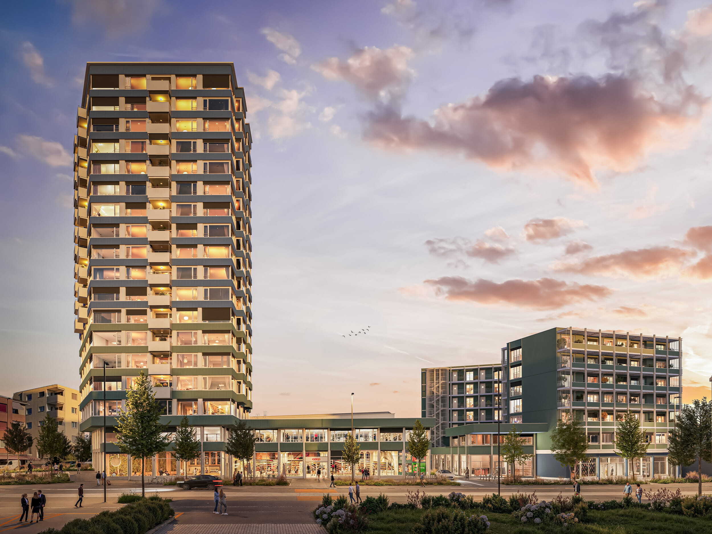 With retail space, studios, modern offices and rental flats, the project brings living and working together in an ideal way. Short distances, urban comfort and private retreats complement each other to create a new centre for everyday life, work and leisure.