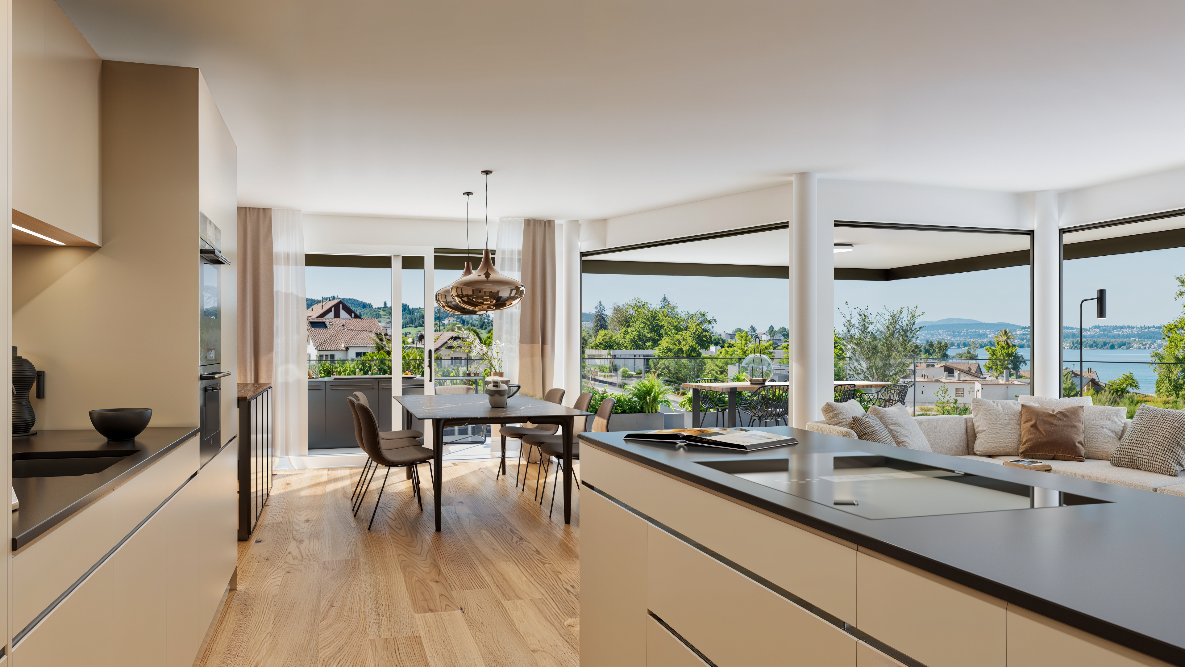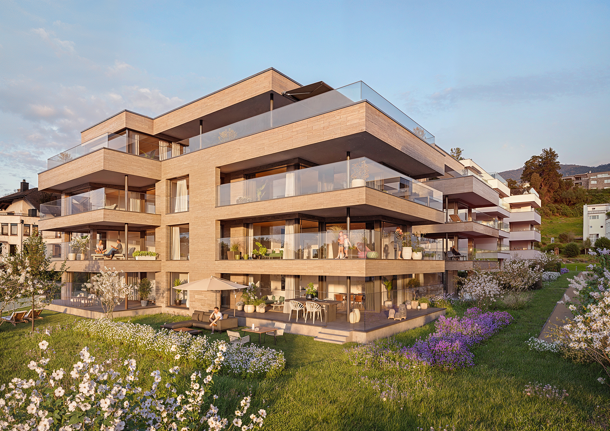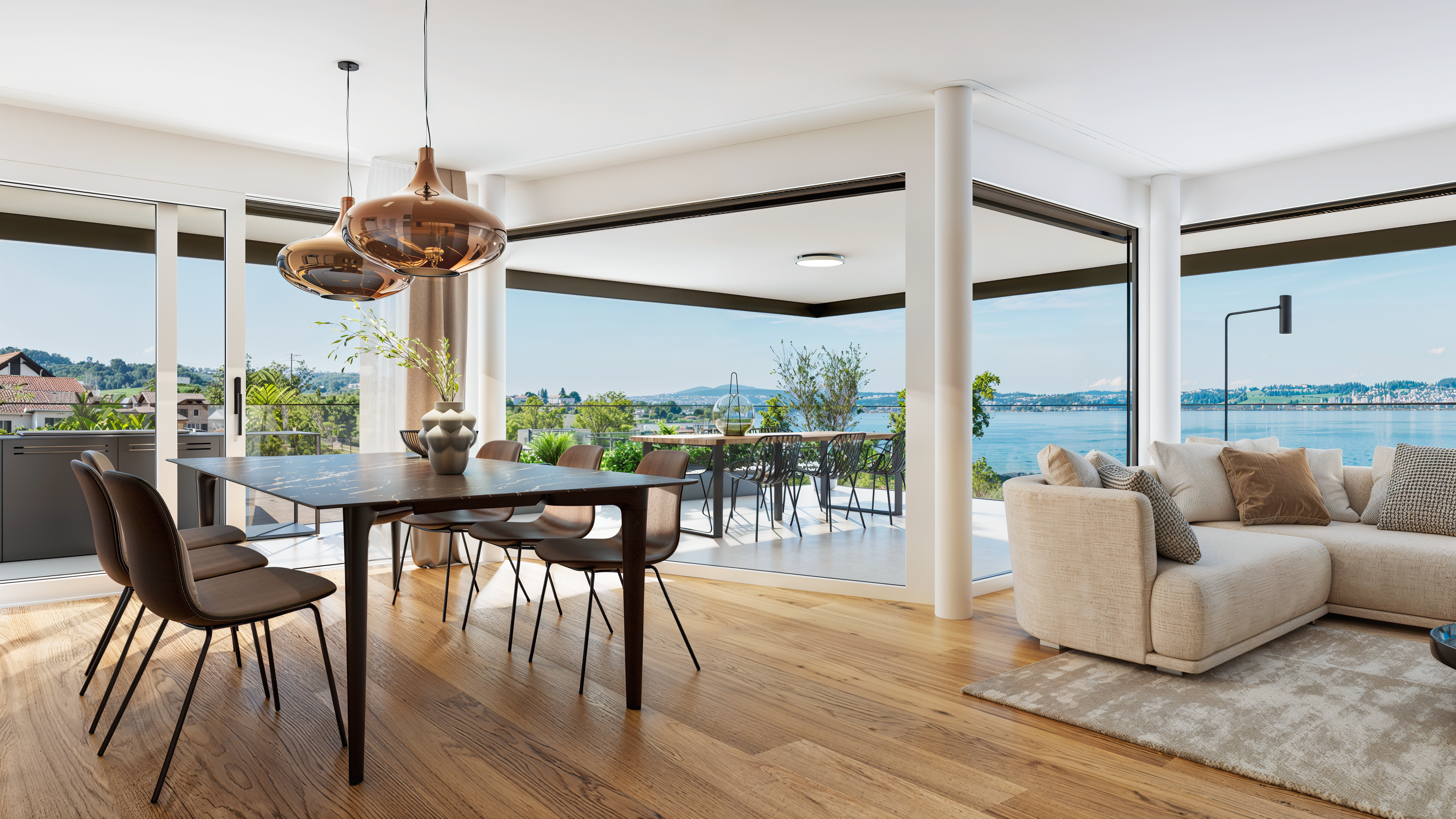 In Altendorf, on the idyllic southern shore of Upper Lake Zurich, a unique residential project that combines sophisticated architecture and an exclusive location is taking shape. The buildings have been skilfully positioned so that each apartment will enjoy a picturesque view of the lake and optimal sunlight at the same time. The living and dining areas, complemented by charming terraces, are orientated alternately to the east and west, creating a pleasant sense of space. Each apartment is lit from two sides and offers flexible furnishing options as well as an impressively spacious corner living and dining area with seamlessly integrated terrace – these are spaces that are designed to be enjoyed.